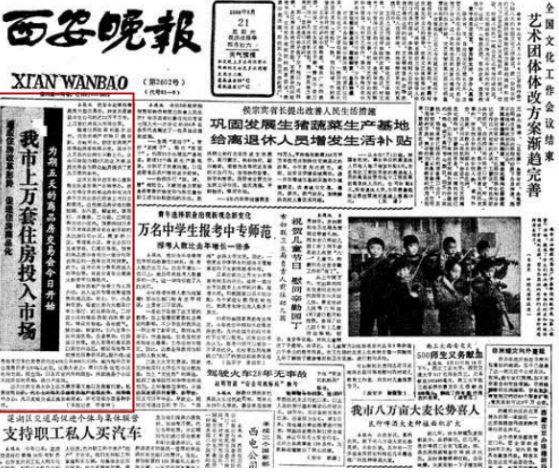 “70年代一张床,80年代一间房,90年代要厅堂。 ”上世纪80年代,随着住房改革措施的逐步出台,西安房地产市场日趋活跃。据西安本土摄影师严建设回忆, 1985年,西安市第一批商品房上市,地址在如今的西后地一带,开盘后挂牌价为98元/平方米。当年的商品房面积都很小,一般一套单元的面积约50平方米、一般结构为一明两暗,进门就是厨房,厨房一侧有个极小的卫生间,两侧为卧室,卧室有窗子,厨房卫生间没窗子。可供两代人居住或三代同堂,当年一套这样的房子价格不超过5000元。